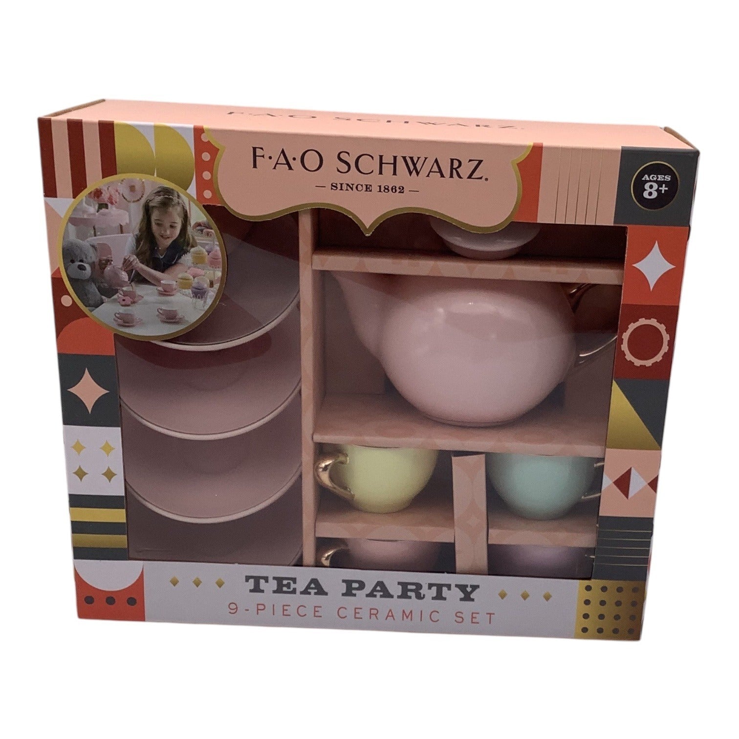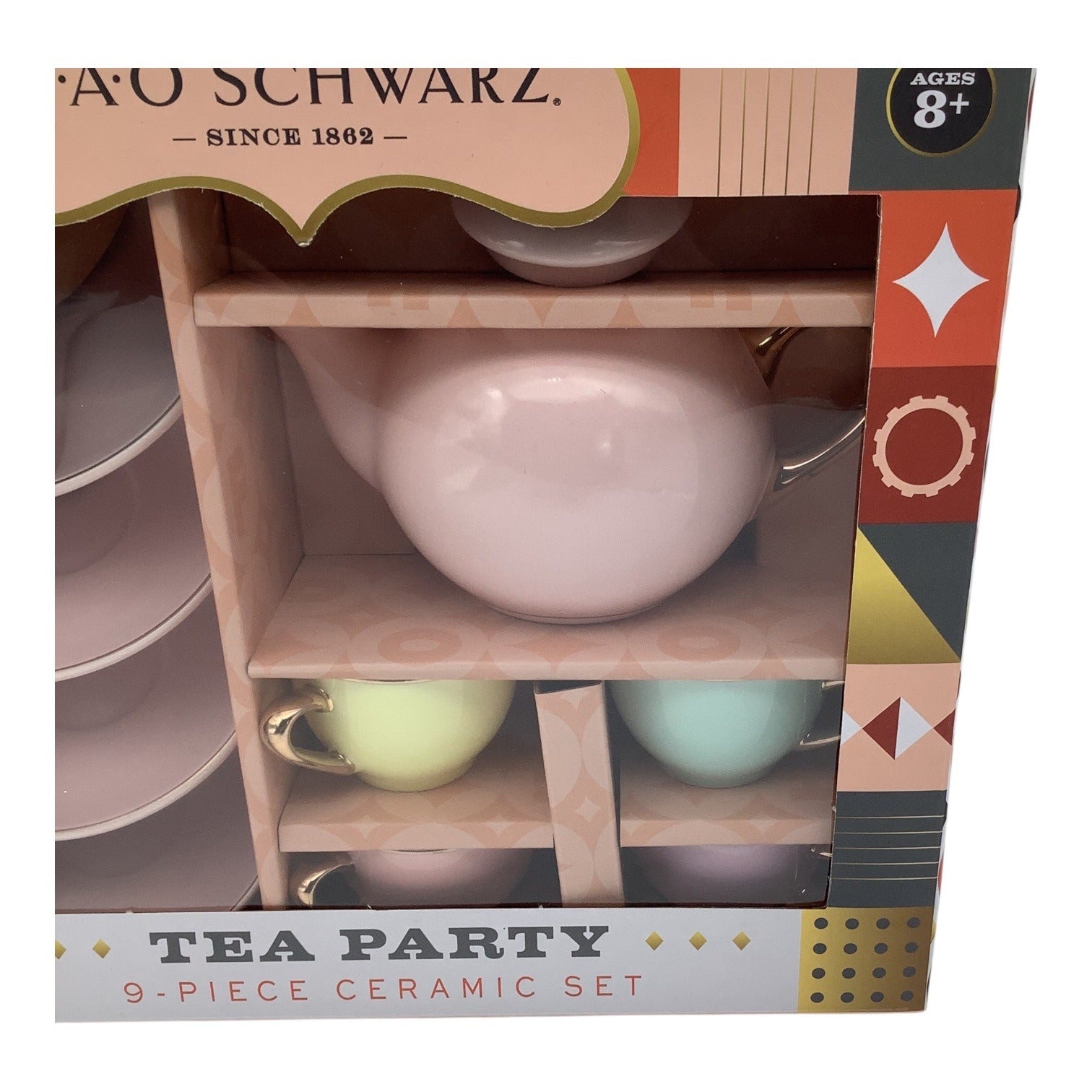 FAO Schwarz 9-Piece Ceramic Tea Party Set For Kids Hand Glazed Porcelain Teapot -